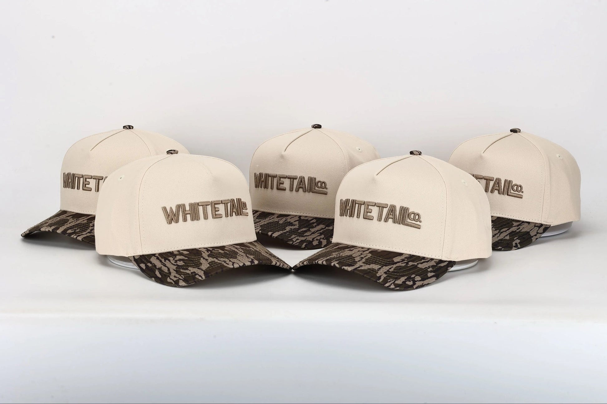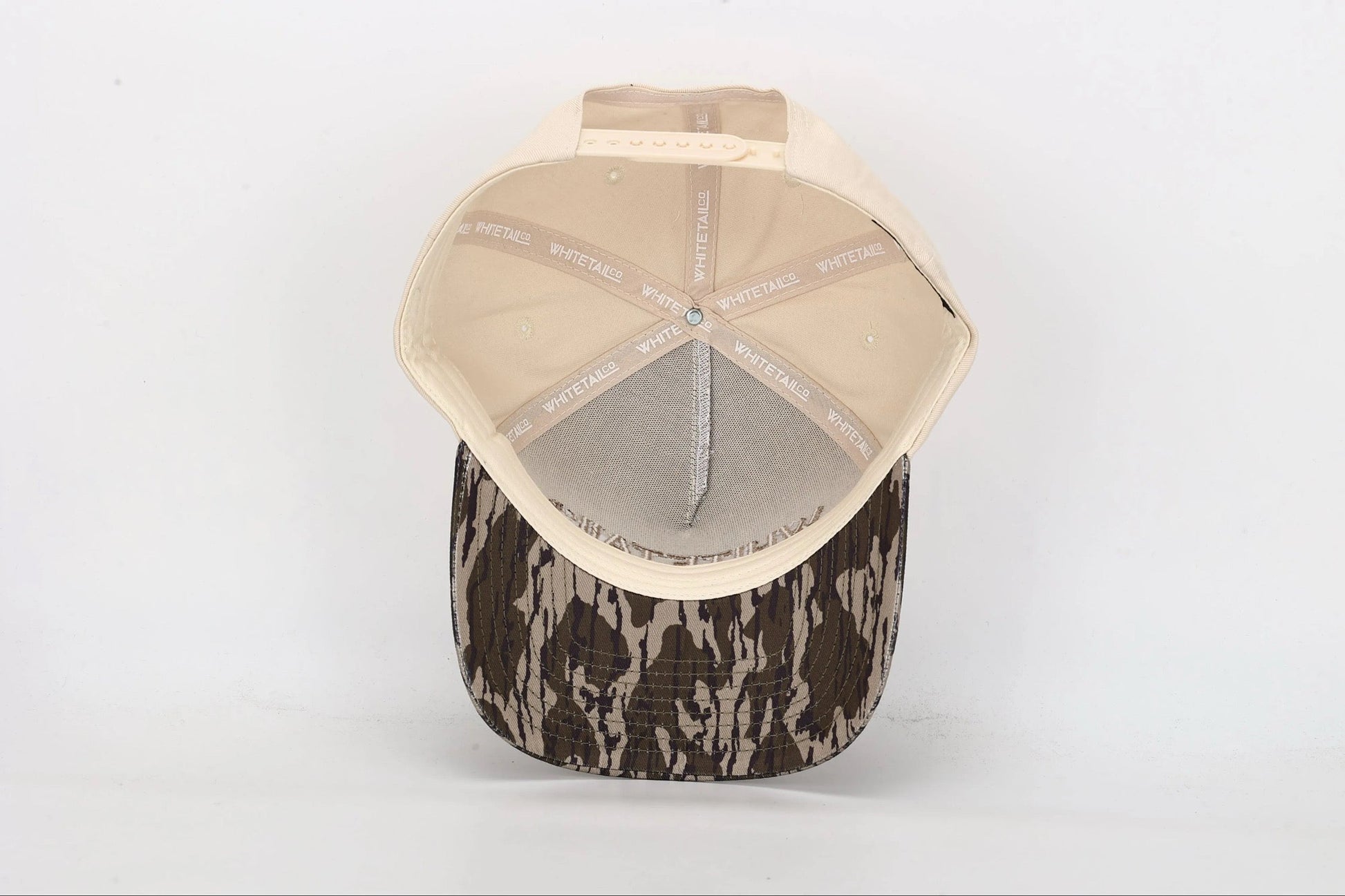 The Whitetail Co. Washed Brim Trucker features a high front and curved brim for a classic fit and sun protection. Its washed camo brim adds rugged style, while the puff embroidered logo offers a premium, textured detail. The solid back ensures a clean look, making this hat a versatile favorite for both men and women seeking durable, stylish headwear.