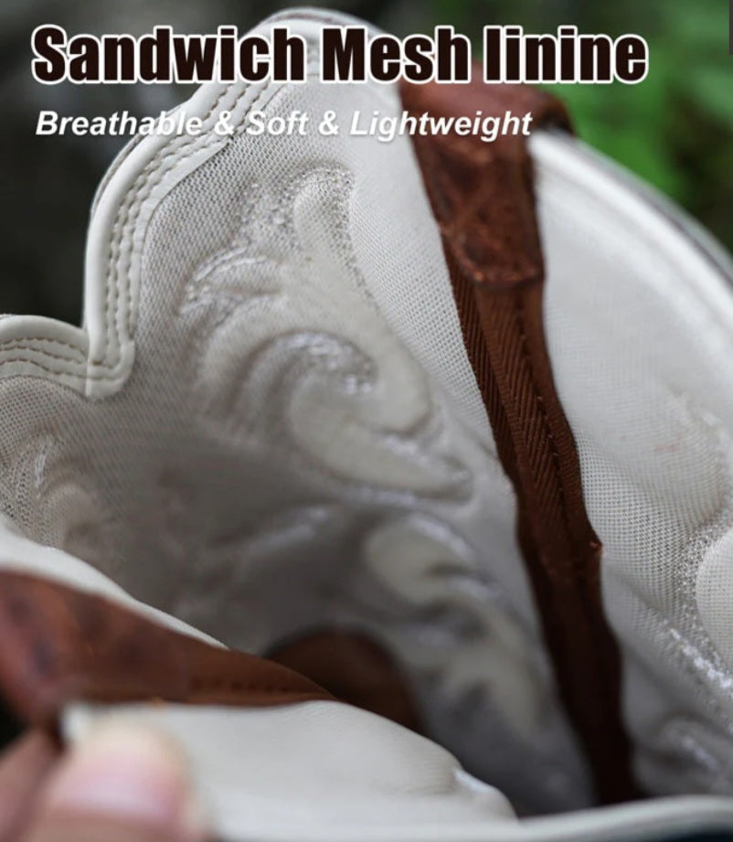 Authentic Western boots for women featuring intricate embroidered designs, breathable mesh panels, and a popular wide square toe profile—all finished with heritage stitch patterns for rugged-yet-refined cowboy style