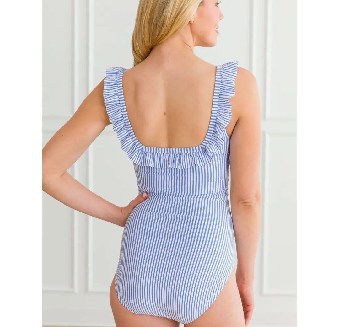 Women's Periwinkle Blue Seersucker Ruffle One Piece Swimsuit